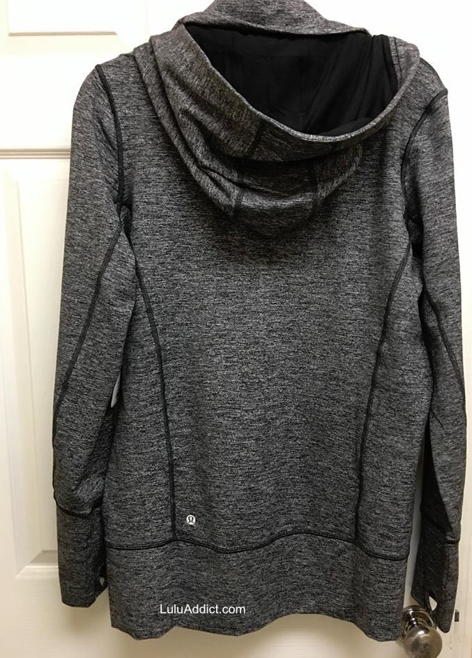 I liked the Black Stride II Jacket I ordered the other week so much that I went back to order the Heathered Black. Here are some detail photos for those of you who own older Strides or are new to Strides (like me) and are in the market for a longer jacket. Unlike the Define, the Stride has roomy upper arms. I took a few measurements for you: the armpit to hem length in my size 12 is 19.75" and the length from the hood attachment point on the shoulder to hem length is 28.75". The pit to pit width measurement is 20". The jacket has double zippers. I've read criticism that the front pocket entry is a little small and I have to agree. Fortunately, there are two interior pockets, similar to the Define, which is where I stash my phone. The Heathered Black is super soft but I suspect it's the type of luon that tends to pill easily which is going to show up in the armpit area the most on this jacket. If you want a workhorse Stride that you are going to wear a ton I'd recommend the Black or Heathered Slate. I seem to remember people sizing down in this jacket but I want to layer under it so I am not. I hope lululemon makes more colors of these. I'm really glad lululemon brought these back.