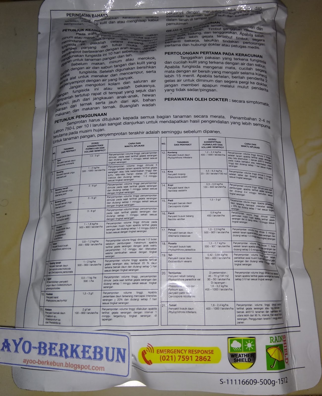 Pada waktu menyemprot, jangan makan, minum atau merokok. Pada waktu membuka wadah, memindahkan, mencampur dan menyemprot fungisida ini, pakailah celana Panjang, baju berlengan Panjang, dan tutup muka. Jangan menyemprot berlawanan dengan arah angina. Jangan menggunakan fungisida ini 10 hari sebelum tanaman dipanen untuk tanaman pangan dan the,