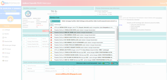 Pada saat admin melakukan Validasi, disinilah titik permasalahan kenapa pada halaman Aplikasi Manajemen Dapo PAUD-DIKMAS, Dapodik PAUD Online tidak berstatus Sukses alias belum berhasil sinkron. Dikarenakan, data-data yang ada di Dapodik PAUD Online masih ada yang Invalid. Seperti gambar dibawah ini.